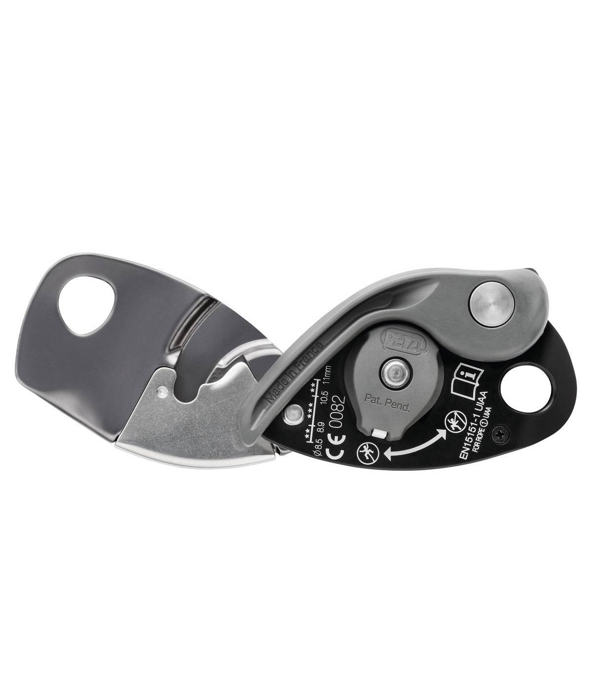 - Compacto y muy ligero con 170 g. - Frenado asistido: durante la detención de la caída, el asegurador sujeta el cabo libre, la leva gira y pinza la cuerda, y aumenta así el frenado hasta detener la cuerda.