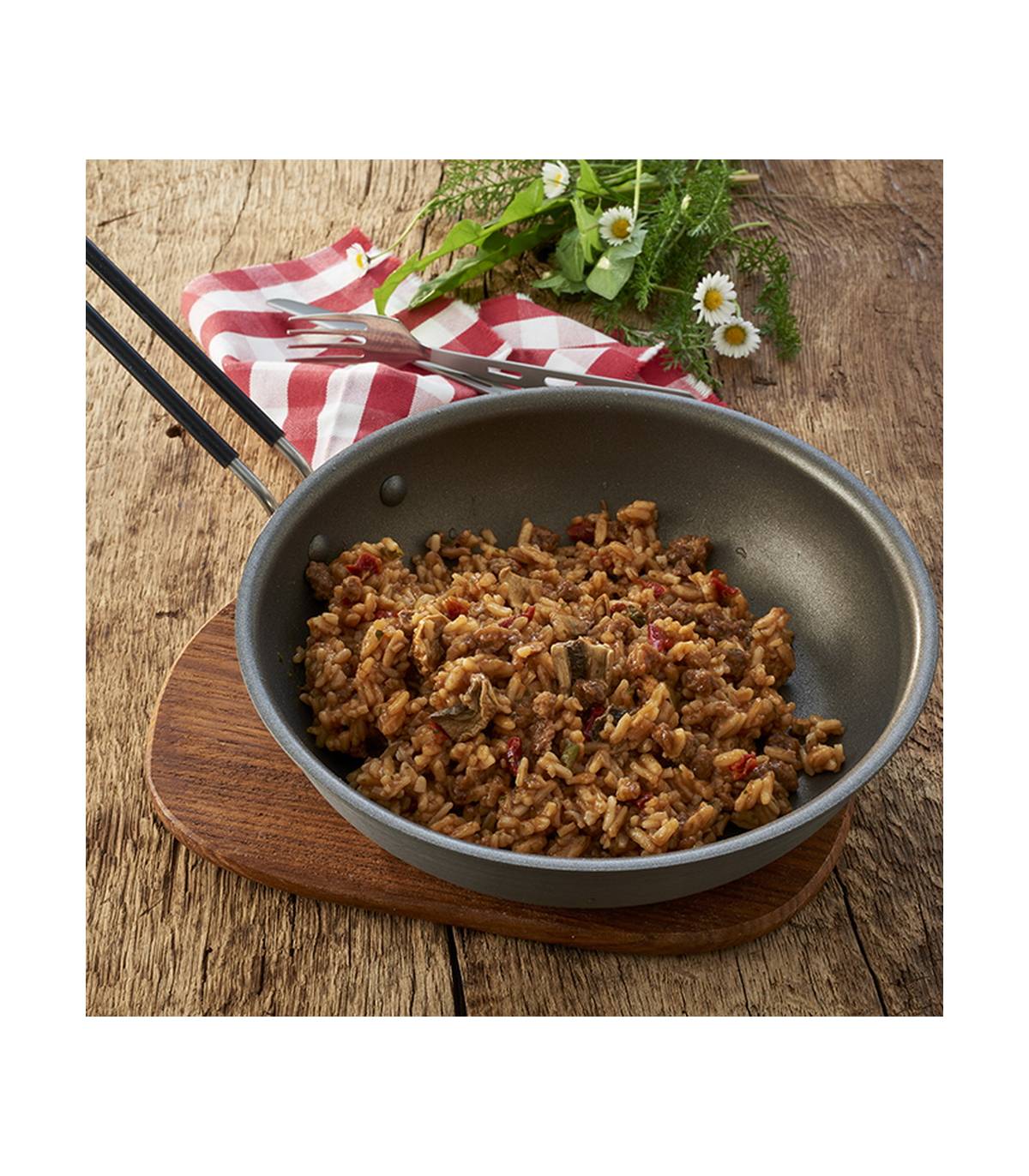 Ingredientes: arroz de grano largo 47%, Aceite de girasol en polvo (contiene leche, E551), carne de vacuno 10%, maltodextrina, champiñones, fécula de patata, almidón modifi cado, concentrado de proteínas de suero, pimiento, tomates, sal, perejil, pimienta, acidificante ácido cítrico, extracto de romero, aroma natural. Contenido de carne seca: 16 g (equivale aproximadamente a 63,5 g de carne fresca).