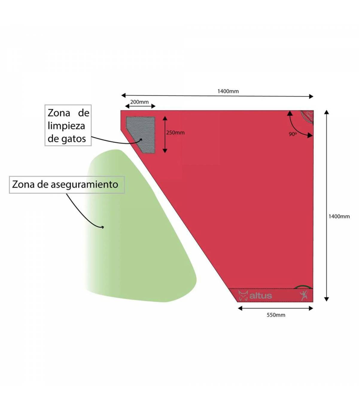 Su diseño funcional incluye dos bucles diferenciados por colores para identificar fácilmente los extremos de la cuerda, además de una zona de limpieza para retirar el polvo o barro de los pies de gato antes y después de escalar. También incorpora una zona de aseguramiento, con forma triangular, que libera espacio para el asegurador, evitando posibles tropiezos y mejorando la seguridad en la vía.