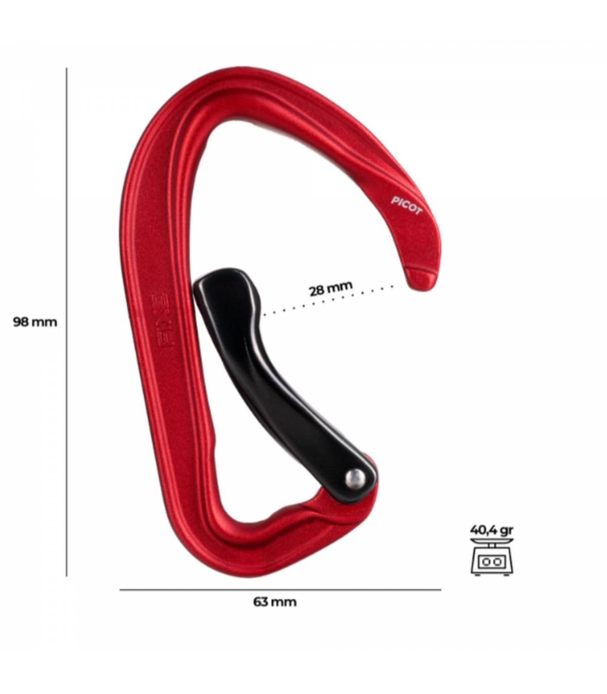 El Fixe Picot Curvo ha sido diseñado con una atención milimétrica a cada detalle. Su geometría optimizada elimina material donde no es necesario, reduciendo el peso hasta solo 40,4 g, sin comprometer la resistencia estructural. Gracias a su diseño Snagfree, el mosquetón evita enganchones accidentales, ofreciendo un mosquetoneo suave y preciso.