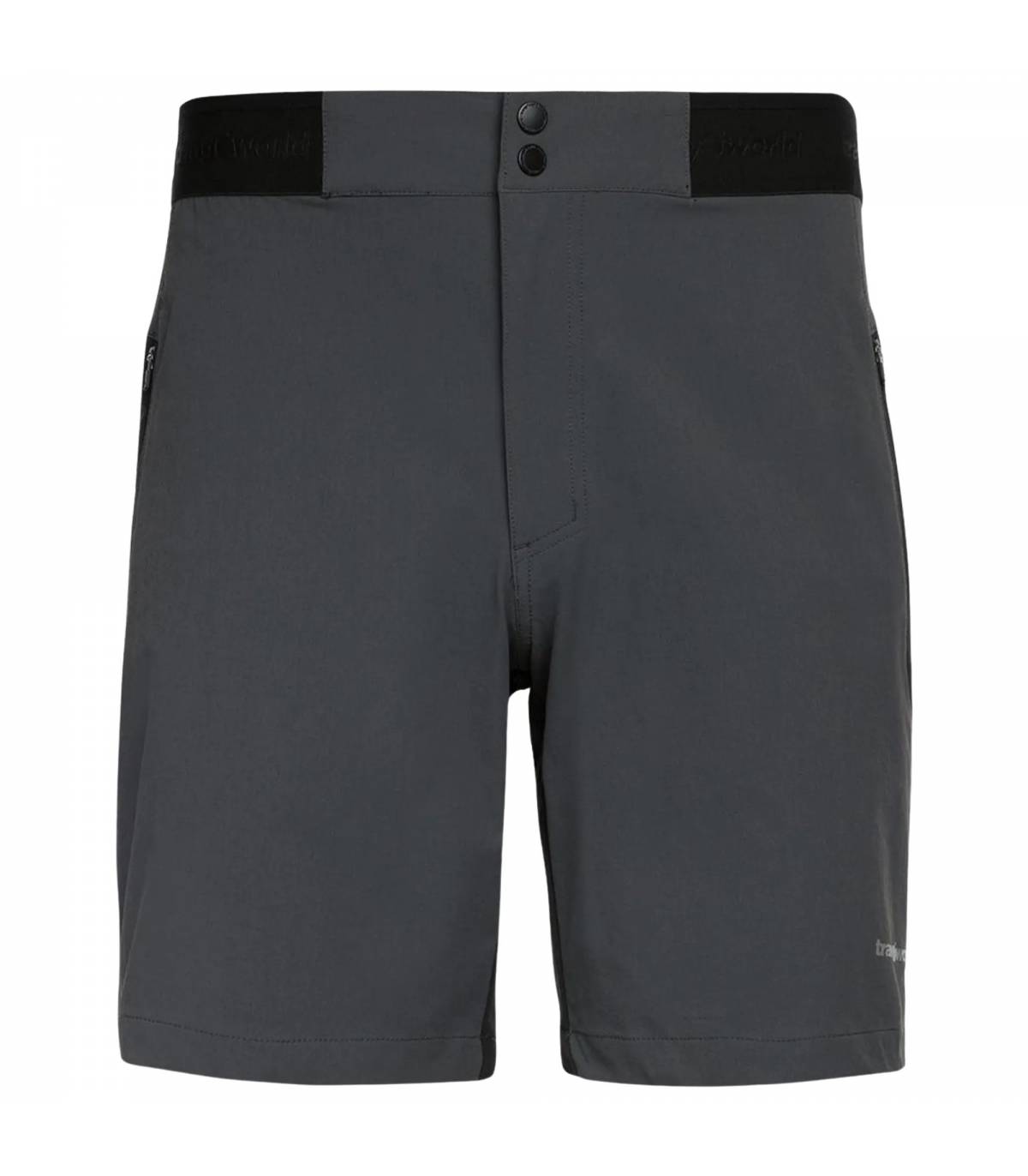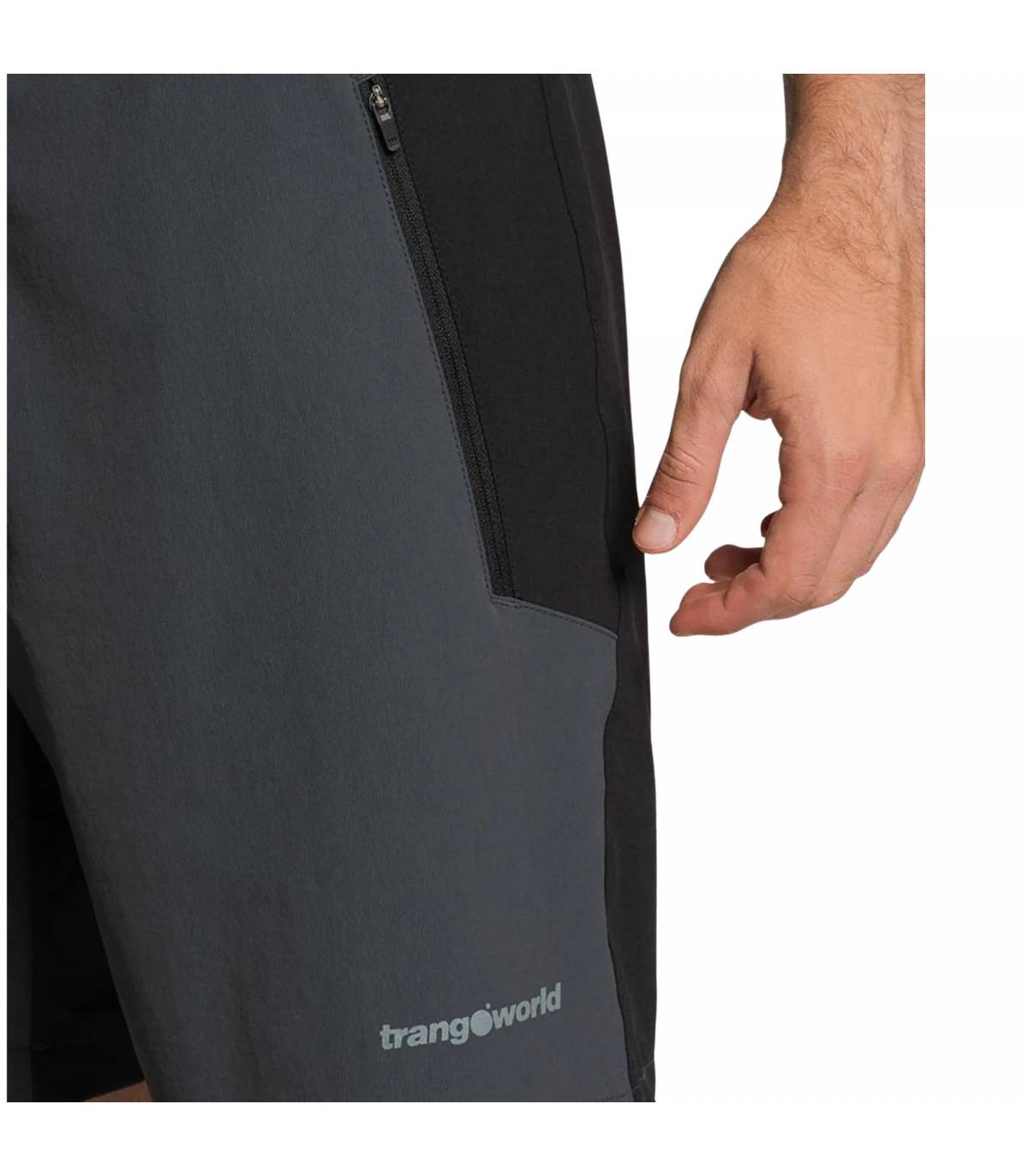 El producto es un pantalón corto de hombre para trekking y montaña. Está confeccionado con nylon reciclado Free4move, incorpora cintura elástica, bragueta con cremallera y tapeta, cierre con botón de presión y gancho, bolsillos laterales con cremallera, bolsillo trasero con cremallera, longitud media, tejido transpirable y tratamiento repelente al agua libre de PFC. En la tienda oficial de Trangoworld aparece con un precio de 64,90 € y disponibilidad en varios colores.